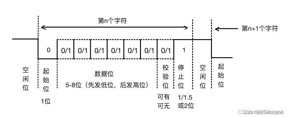 - 校验位:在有效数据之后,有一个可选的数据校验位。由于数据通信很容易收到外界干扰,导致数据传输出现偏差,因此,可以在传输过程中加上数据校验位来解决这个问题。校验方法有奇偶校验,0校验,1校验以及无校验