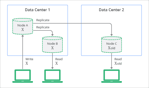 下图展示最终一致性的复制概念。节点B和节点C是两个副本,尽管这两个副本总是可以读取数据,但是不保证副本中的值和最近的一次更新一致。例如,在图中,数据X被写入节点A中,节点B和C含有数据X的副本,节点B可以读取到数据X的更新值,但是节点C依然读取到旧的数据X的值。在一段时间后,节点C会更新数据X。