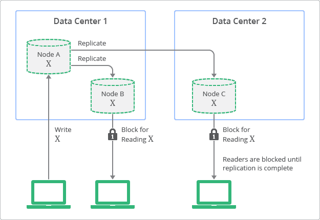与之相反,传统的关系型数据库通常是基于强一致性的概念。这就意味着在数据更新以后,更改后的数据马上会被所有人看到。但是强一致性也是有代价的,为了保证强一致性,开发者必须在可扩展性(Scalability)和性能上做出妥协。简单来说,数据要在更新或者复制过程中上锁,用以确保没有其他的进程会对同一个数据进行更新。下图展示了一个强一致性。在数据X的更新被写入节点A以后,节点B和C的数据X读取都被阻塞,直到所有节点的数据X都被更新。