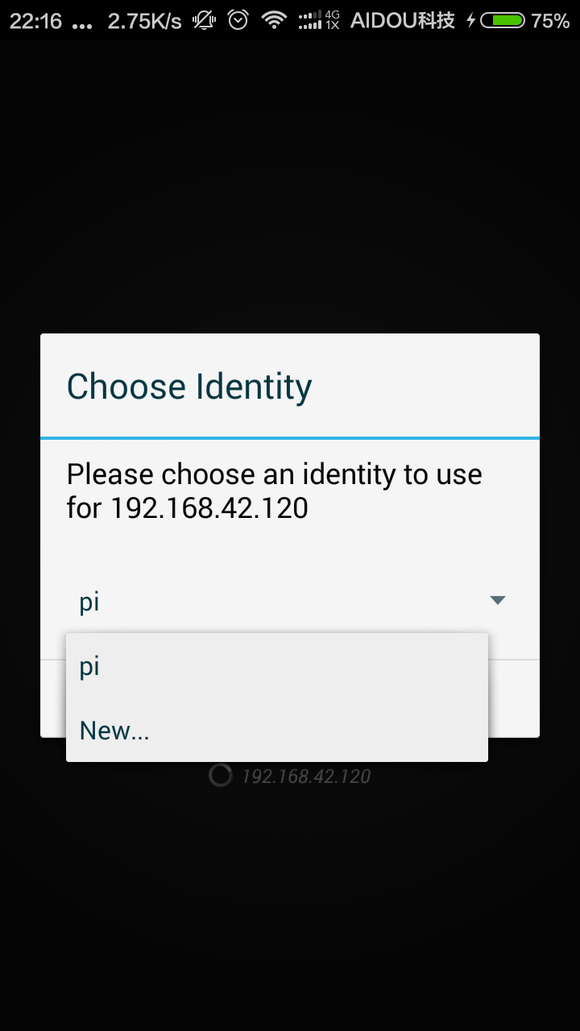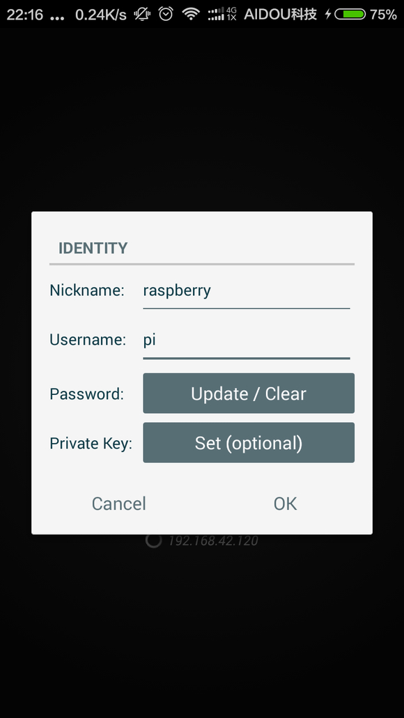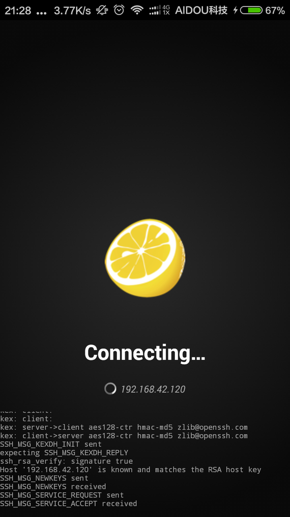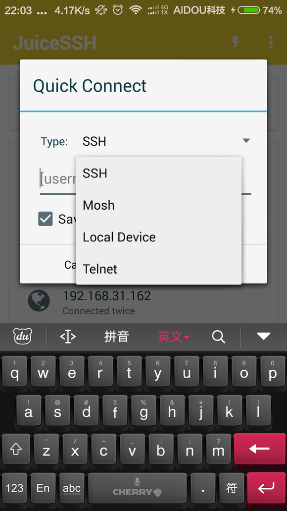 很好,你成功了!打开手机上的 juiceSSH 再次点击闪电按钮,选择SSH连接,填入IP地址,如下图: