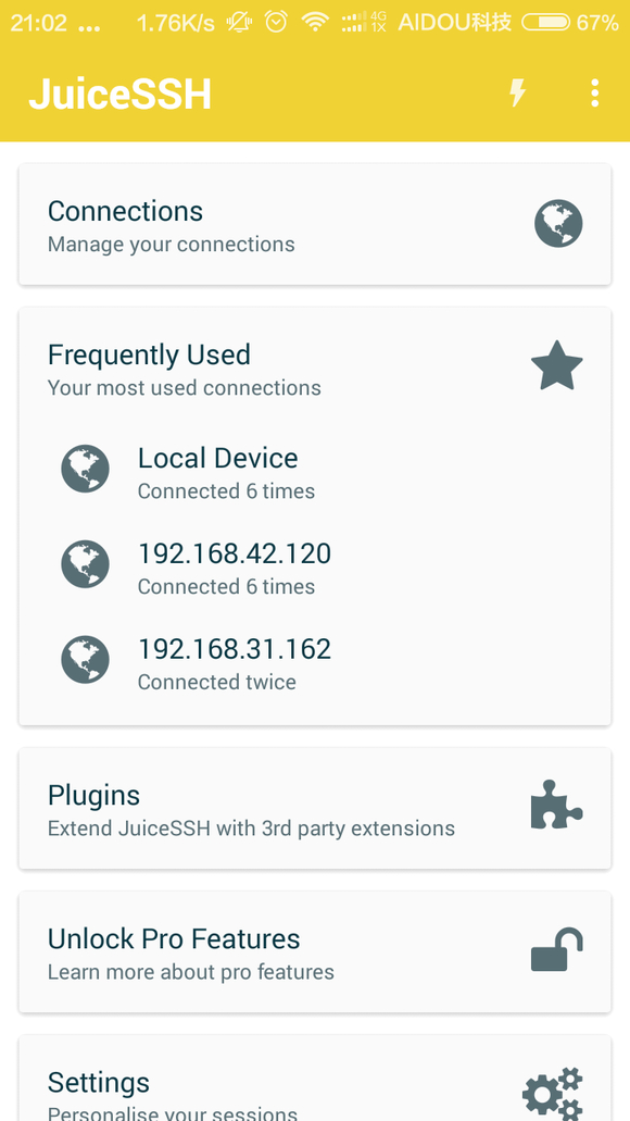 首先在手机上打开juiceSSH,点击右上角闪电