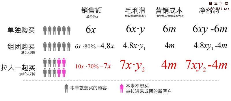 商家角度说,我们来算一笔账,就知道商家为什么从团购中获利,也为什么有无数商家因为团购在亏钱。下图,零售价为x元的商品,利润率为y,单人营销成本是m,商家的促销政策是5个人一团8折,10个人7折。那么