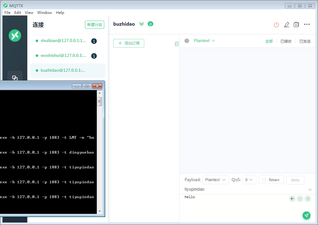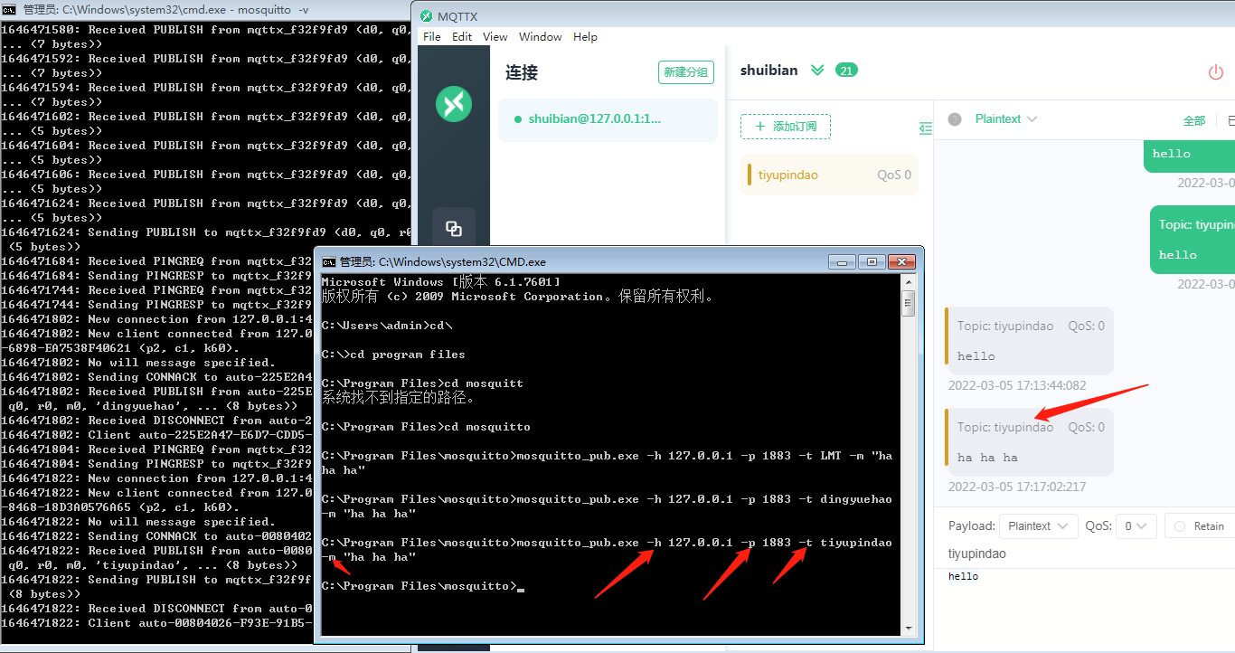 新开一个CMD,相当于记者给电视台发信息,使用mosquitto_pub.exe -h(IP地址) -p(端口号) -t(订阅号)-m(内容)