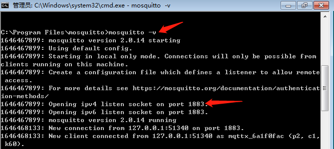 如下图,进入mosquitto安装目录输入mosquitto -v建立服务器,端口号是1883