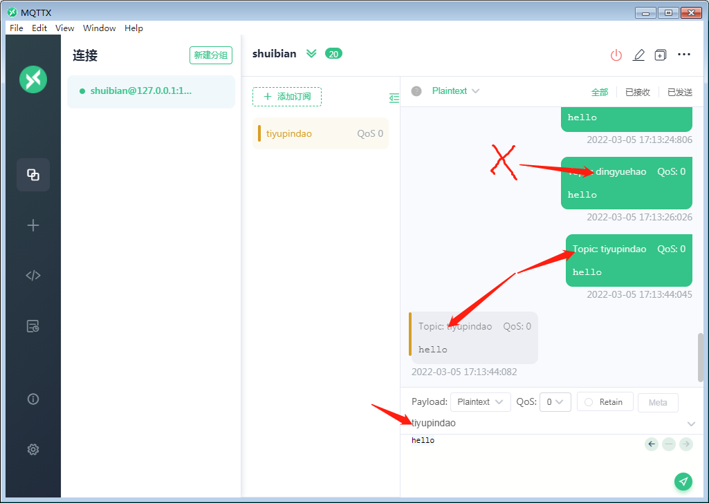 点发送后在MQTTX上收到相应的信息。