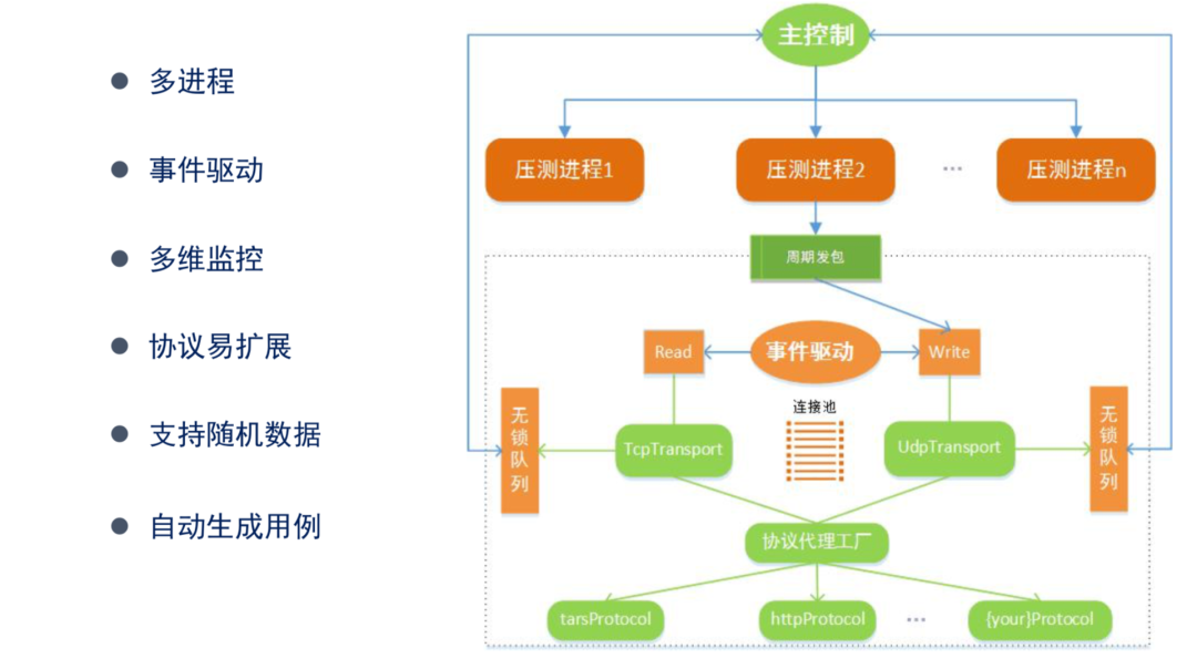 在网络方面,采用的是事件驱动的方式,通过定时发包器读写进程,并通过事件驱动避免网络IO的阻塞。外在连接方面采用连接池,在连接池对每个连接采用连接复用的方式。不依赖于对端是否返回,可以根据返回包的序号定位到发包的性能和发包的时间,也可以计算压测过程当中的一些耗损数据。