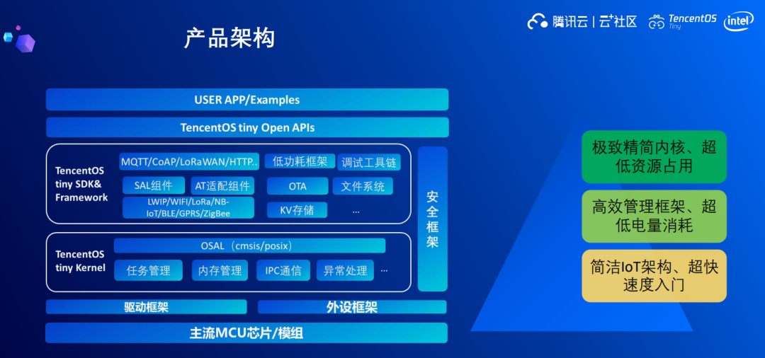 再往上面是TencentOS Tiny的核心基础内核,再上面是物联网所需要的联网组件,提供了 IoT 常用的功能组件,比如文件系统、KV存储和高级语言引擎框架等等,提供了方便用户调用的业务层API,业务层上也会提供常用的案例供客户和开发者参考。除此以外,此架构内置了安全框架,为终端设备的设备唯一标识、通信链路加密、密钥安全存储提供了保障,防止物联网设备被攻击。