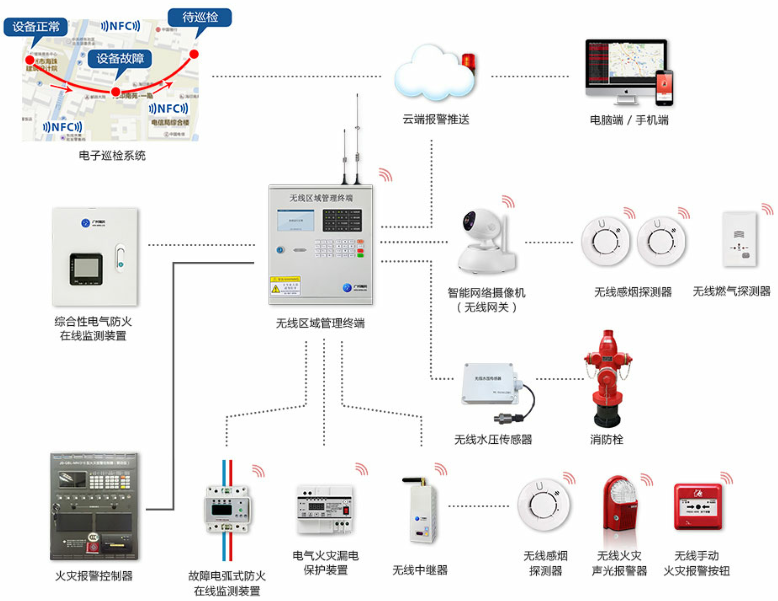 硬件:电弧检测装置、电气火灾检测装置、无线终端(连接xxx传感器---无线烟感传感器、消防栓-水压传感器、监控-摄像头、燃气传感器)