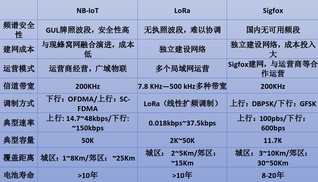 运行商运营:NB-IoT不需要考虑网络运营维护成本。LoRa、sigfox:需要自己进行网络运营、维护。