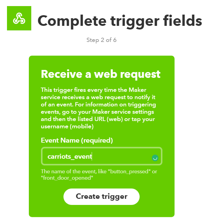 选择Maker webhooks以启用IoT maker。 现在,我们必须配置maker服务,添加触发触发发送消息过程的事件名称: