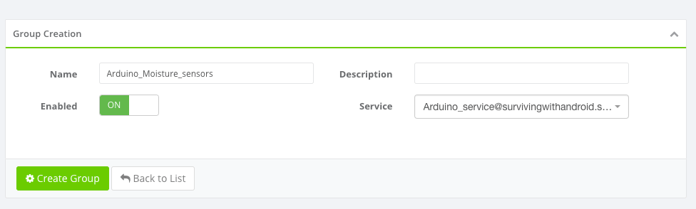 步骤非常快,您只需执行一次。 最后一步是配置我们的设备。 它代表我们用来发送数据的物理设备。 该设备属于在最后一步中创建的组,而该组又属于服务。 该服务属于项目。 如下图所示,配置步骤非常简单: