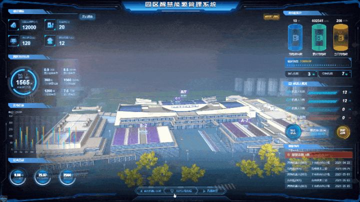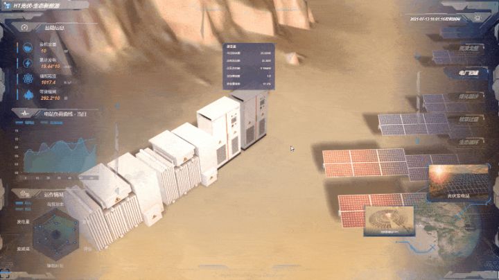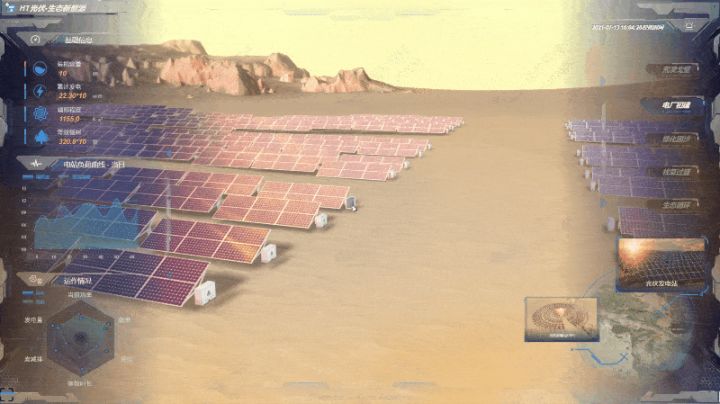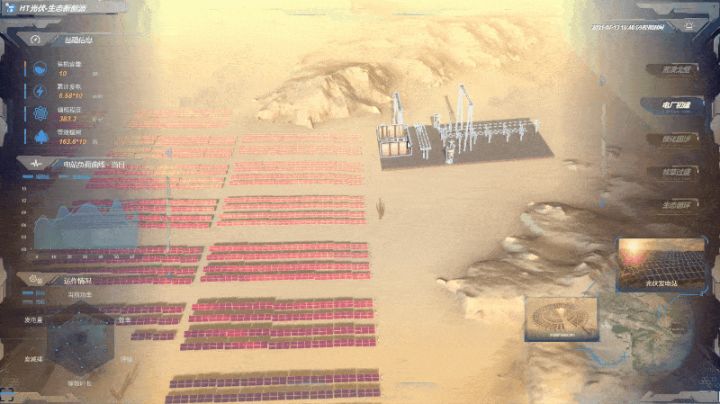 运用 Hightopo 自主研发引擎 HT for Web,实现可交互式的 Web 三维场景,通过线条流动的方式表达光伏从光能转化为电能、再到设备供电、储能全流程。结合 HT 引擎强大的渲染能力,保证场景在 Web 中高效流畅地加载运行并保证场景优秀的可视化效果。