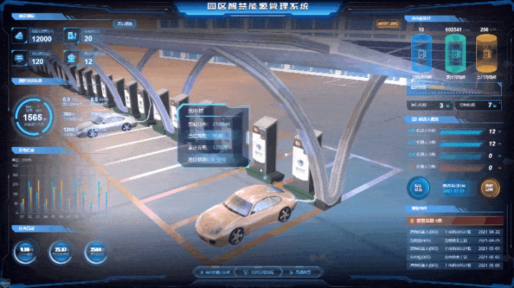 监测园区充电桩运行状态及实时功率,可通过对接充电桩的充电状态,判断当前车位是否有车辆,通过线条流动效果动画模拟充电状态。在充电桩发生故障时,通过模型染色、告警动画等效果提示,为充电桩的实时使用情况和运行监控维护提供了便利。