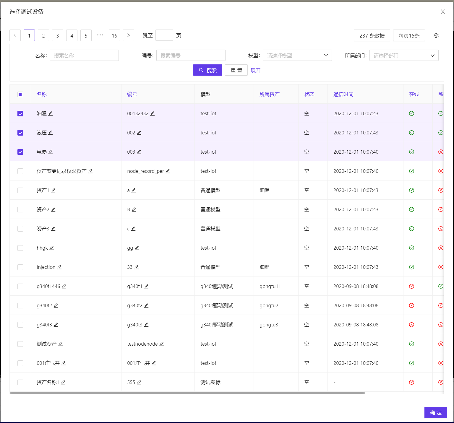 设备调试用于平台接入资产后,进行数据的调试,可以查看是否上数,判断接入是否有问题,设备调试可以选择多个资产同时进行,点击【添加调试设备】按钮,在弹出的资产选择弹窗中可以对资产进行过滤查询及选择,如图所示:设备调试页面说明显示如图所示:
