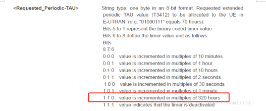 <Requested_Periodic-TAU>:一字节8位数据格式。在E-UTRAN中UE请求的TAU扩展周期值。 数据高3位为单位值,低5位为对应单位扩展倍数(例:“01000111”中“010”为“10h”单位,“00111”为对应档位扩展7倍,即请求的TAU周期扩展值为“70h”)。PSM状态请求的TAU周期参数表。