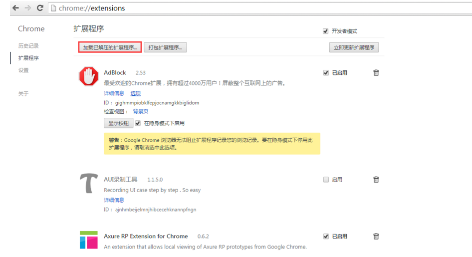 点击「加载已解压的扩展程序...」按钮,找到你刚刚下载的安装包的位置,点击确定。