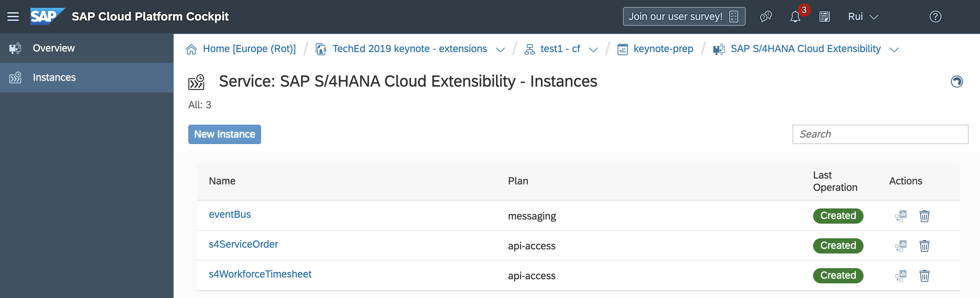 以为SAP S/4HANA Cloud创建扩展为例,首先基于Open Service Broker API创建一个S/4HANA Cloud Extensibility Service的实例,然后在该subaccount space下的开发人员,即可将该实例绑定到自己创建的扩展应用去,并消费该实例暴露的服务。