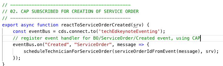下图是对应的编码实现订阅S/4HANA Cloud系统服务订单创建事件并作出响应的例子:通过eventBus实例注册ServiceOrder.Created事件,在其触发后,调用技师分配函数进行响应。