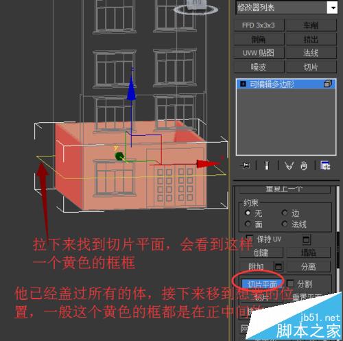 2、选择想编辑的面或多边形,点击切片平面,(如图),会出现一个切片平面,可用旋转命令将黄色的切片平面旋转到想要的位置,切片平面作用就像一把刀