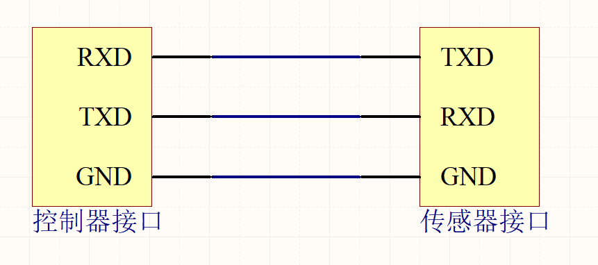 连线时需要将控制器TXD、RXD和传感器TXD、RXD交叉连接,连线效果如下所示: