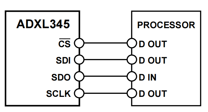 例如,驱动ADXL345三轴加速度传感器,将控制器SDI/MISO、SDO/MOSI、SCLK、CS/SS和三轴加速度传感器SDI/MISO、SDO/MOSI、SCLK、CS/SS对应连接