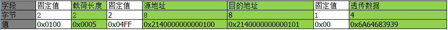 左边节点地址为2140::100向2140::101发送字节数据:0x0102030405