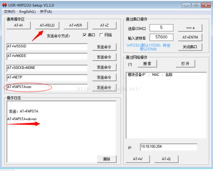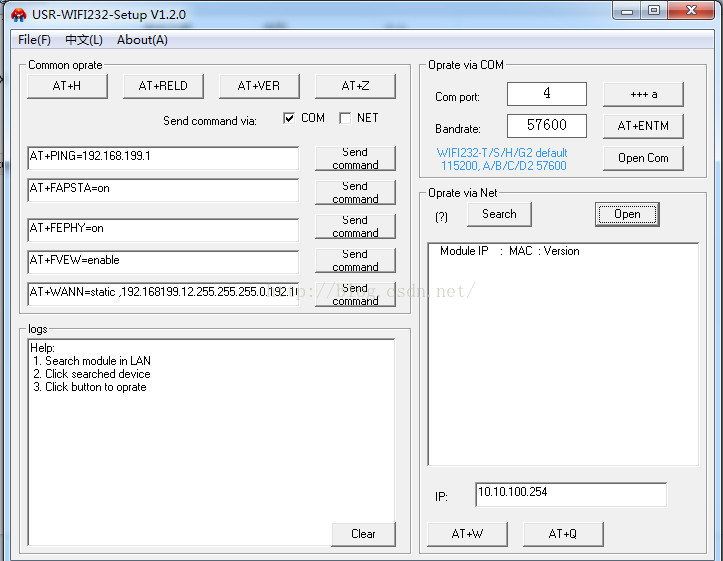 然后配置相应的波特率(模块默认是57600)和串口号(默认串口4)。