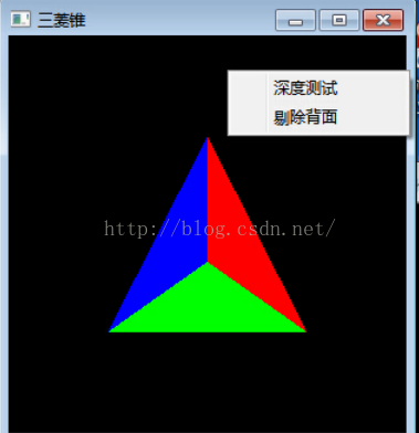 来实现。启用剔除技术后,我们发现三棱锥的底面消失了,这是因为在绘制的过程中,我们都使用了顺时针绕法的多边形正面,但这样底面的正面正对着三棱锥的内部,故此启用剔除技术后把底面剔出掉了,要改变这种状况,可以在绘制三棱锥的底面前调用函数