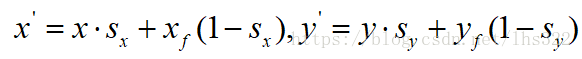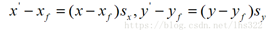 当缩放系数绝对值小于1时,缩放对象向原点靠近;当缩放系数绝对值大于1时,缩放对象远离原点。我们可以选择一个在缩放后不改变位置的点,称为固定点。固定点设为(xf,yf),缩放后的坐标可计算为:
