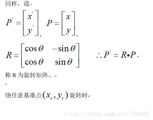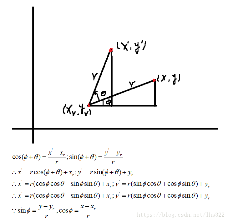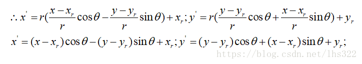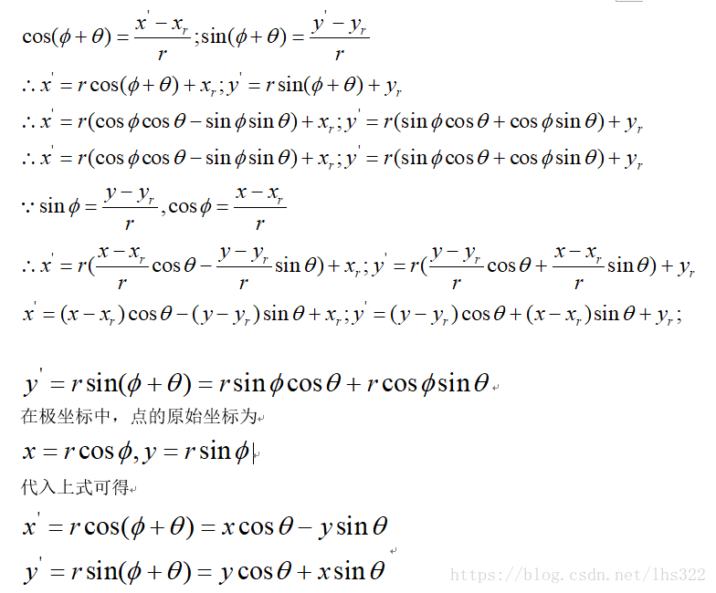当绕原点旋转时,设是点的原始角度位置与水平线的夹角,是旋转角。旋转后的坐标表示为: