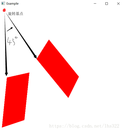 实例:将上个例子的四边形,输入旋转基点,绕指定角度。本次结果为基点(0,450),旋转角度45°。代码与平移相似,只展示核心代码: