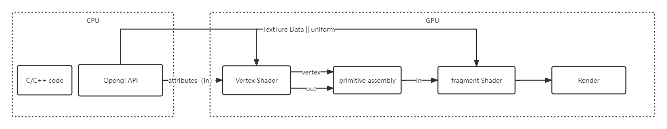 简单来说opengl的流程,首先调用opengl的接口,将Attributes、textturedata、uniform等数据输入到vetexshader等着色器中,如果是attributes数据,顶点着色器会处理它,并把结果流转到下一个primitive assembly中实现光栅化,紧接着配合textturedata通过片元着色器进行处理,最终渲染出结果,你可以对照着opengl渲染管线图进行参考(本文流程中并未介绍几何着色器,因为它并非是必须的,也许以后我们会详细解释它)。