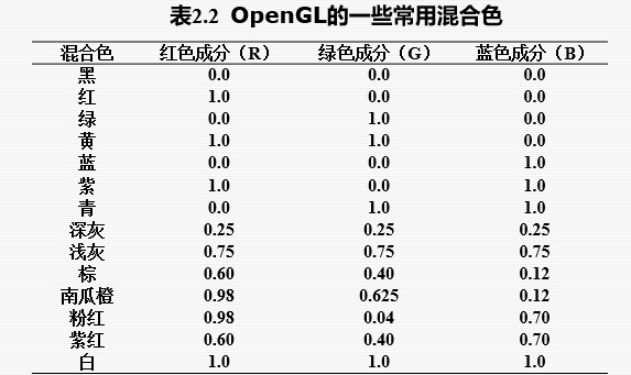 颜色管理,使用RGB颜色模型。一种颜色用红、绿、蓝三种颜色成分混合而成,每种颜色成分使用0.0到1.0之间的任意有效浮点数来表示颜色值。