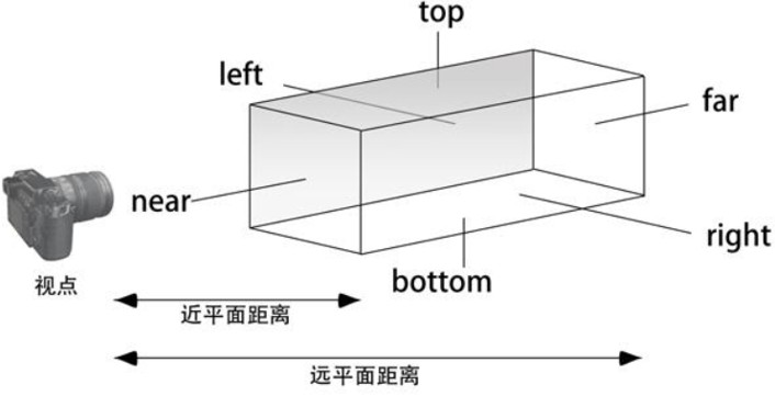 void glOrtho(left,right,bottom,top,near,far);设置投影方式为正交投影(平行投影),其取景体积是一个各面均为矩形的六面体;