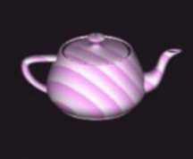 以上程序运行结果是在屏幕上显示一个带条状纹理的茶壶。其中用到了前面所讲的一维纹理映射定义,以及本节的纹理坐标自动产生。