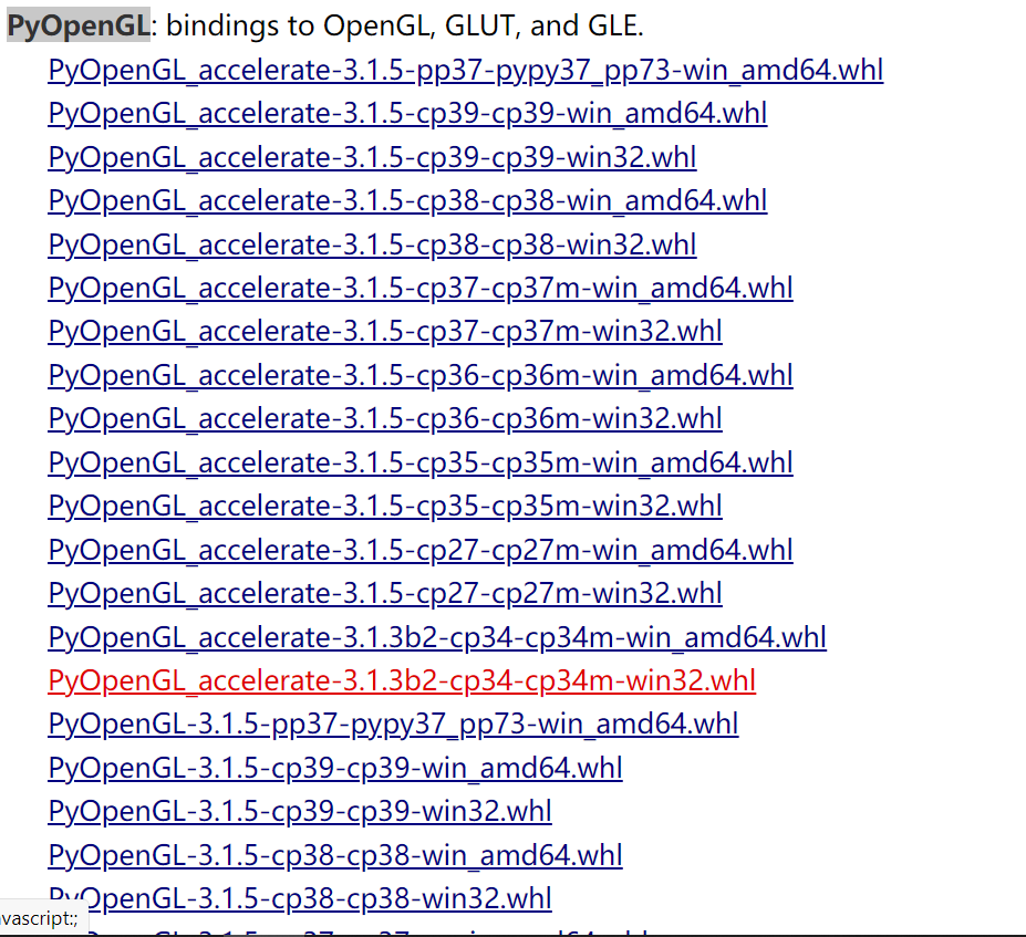 2)根据自己安装的python版本选择合适的两个安装包:一个pyopengl-accelerate包和另一个pyopengl包。之后进行pip install XXX.whl安装。