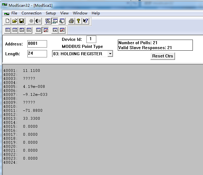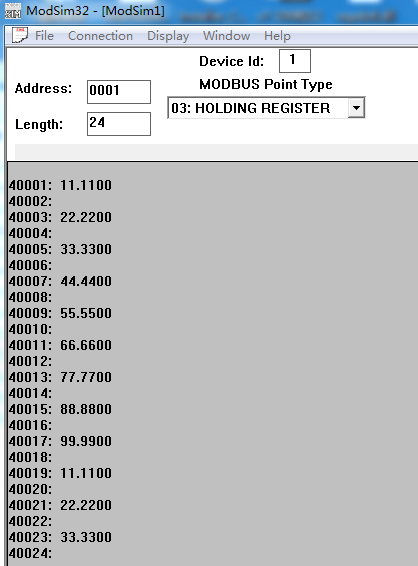 用modscan扫描一下看组态王到底接收到了些什么数据,仔细分析发现数据到40013就结束了,感觉像是地址重叠了,