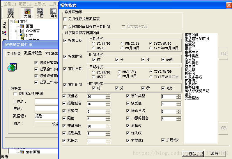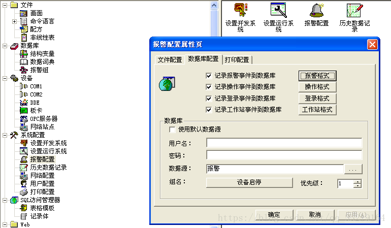 打开组态王的工程找到系统配置--报警配置--数据库配置-报警格式把里面内容设置好,如果需要操作记录等把“操作格式”、“登陆格式”、“工作站格式”也要配置下。