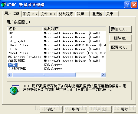 在控制面板----管理工具中建立ODBC数据源,命名为”报警“,如下图: