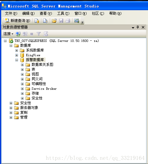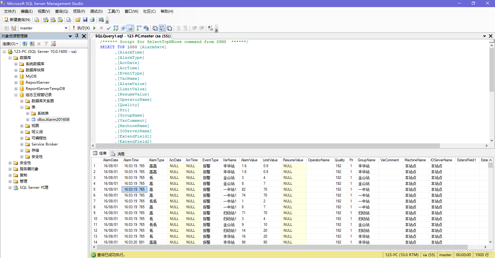 运行系统进行测试。产生报警信息后,这些信息就会记录在sql server数据库中,打开数据库进行查看