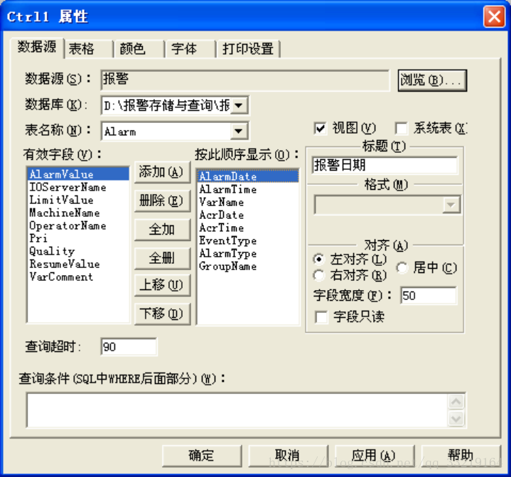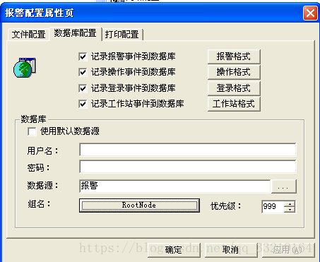 再在报警配置里面把使用默认数据源去掉,数据源处选择第二步ODBC建立的“报警”