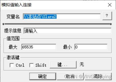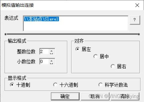 第19步:选择模拟值输出,表示用来显示PLC的Q地址发送的数据。表达式处点击问号选择Slave1的链接(等于寄存器地址为0)
