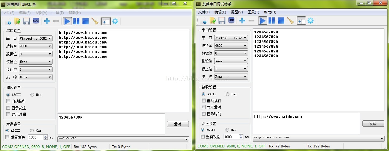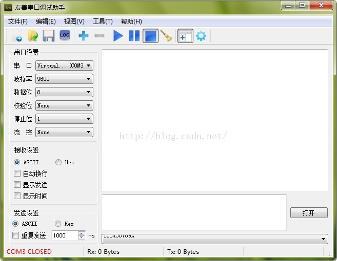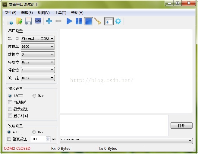 两个串口调试窗口的串口设置保持默认的设置,接受设置和发送设置选择以ASCII码形式发送和接受,此时两个串口处于关闭状态,点击右侧的“打开”按钮,打开COM2和COM3串口,开始通信。
