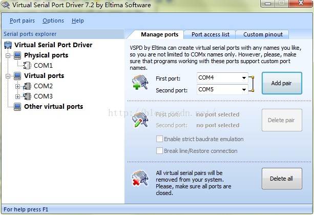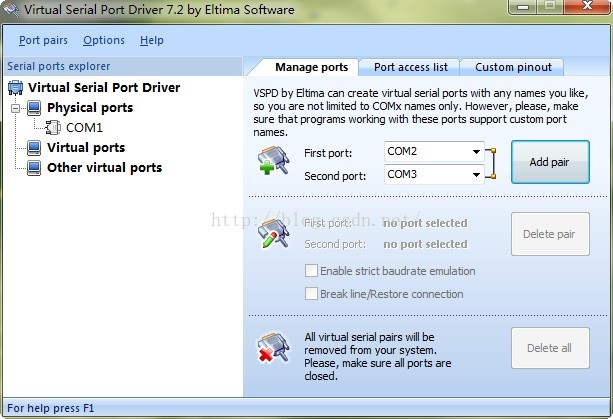 VSPD会自动识别出本台计算上有几个物理串口,例如本机只有一个物理串口COM1。在右侧端口管理的分页中,添加虚拟端口。虚拟端口一定是成对出现的,如CMO2和COM3,其编号由VSPD自动检测本地物理串口资源后,自动为虚拟串口排号。单击“Add pair”按钮为计算机添加虚拟串口,如下图所示: