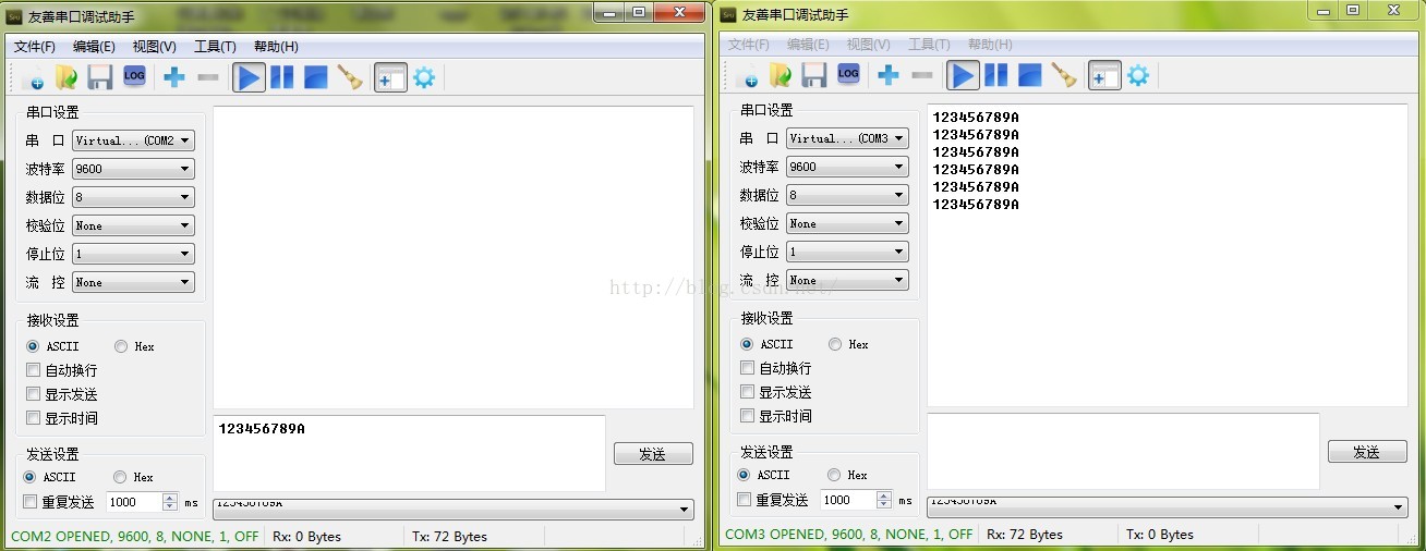 在COM2口的发送栏里输入“123456789A”并回车,然后点击发送,在COM3口的接收区域内就能成功接收有COM2口发来的数据,如下图所示: