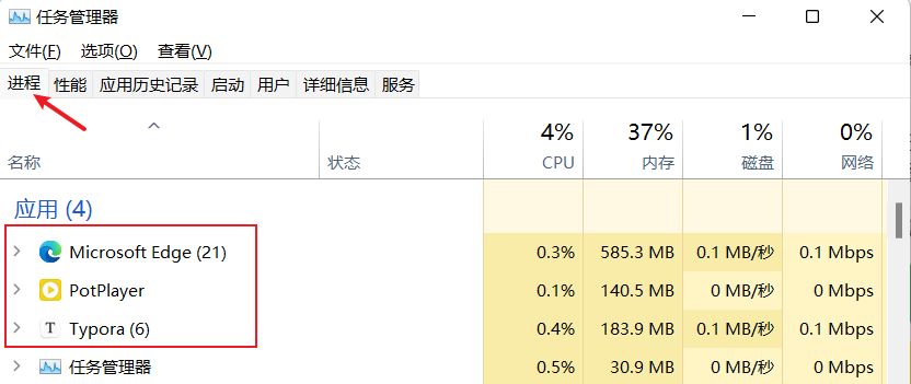 应用程序运行起来就创建了一个进程,即进程就是运行起来的应用程序;如电脑上运行的 Edge、Typora、PotPlayer 等。