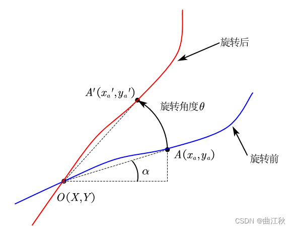 对于如上图所示的任意曲线,需要绕固定点O旋转某一角度,取曲线上任意一点A计算旋转后的坐标值。
