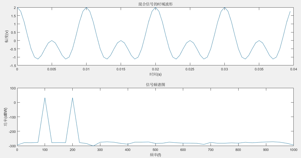 xlabel('时间(s)');ylabel('幅度(v)');title('混合信号的时域波形');