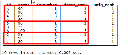 ┌─id─┬─score─┬─rownumber─┬─dense_rank─┬─uniq_rank─┐