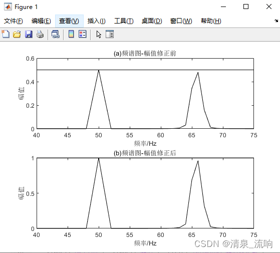 xlabel('频率/Hz'); ylabel('幅值'); title('(b)频谱图-幅值修正后');